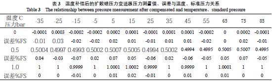 從表1、表3 數(shù)據(jù)可以看出,未進(jìn)行溫度補(bǔ)償前擴(kuò)散硅壓力變送器的溫度漂移很大,在-35℃、壓力為1bar 時(shí)滿量程誤差為0.81%,而采用高階溫度補(bǔ)償模型進(jìn)行補(bǔ)償后的溫度漂移明顯減小,在-35℃~ 85℃的溫度范圍內(nèi),壓力變送器的滿量程誤差為0.07%,擴(kuò)散硅壓力變送器補(bǔ)償后的滿量程精度比補(bǔ)償前提高了10 倍。