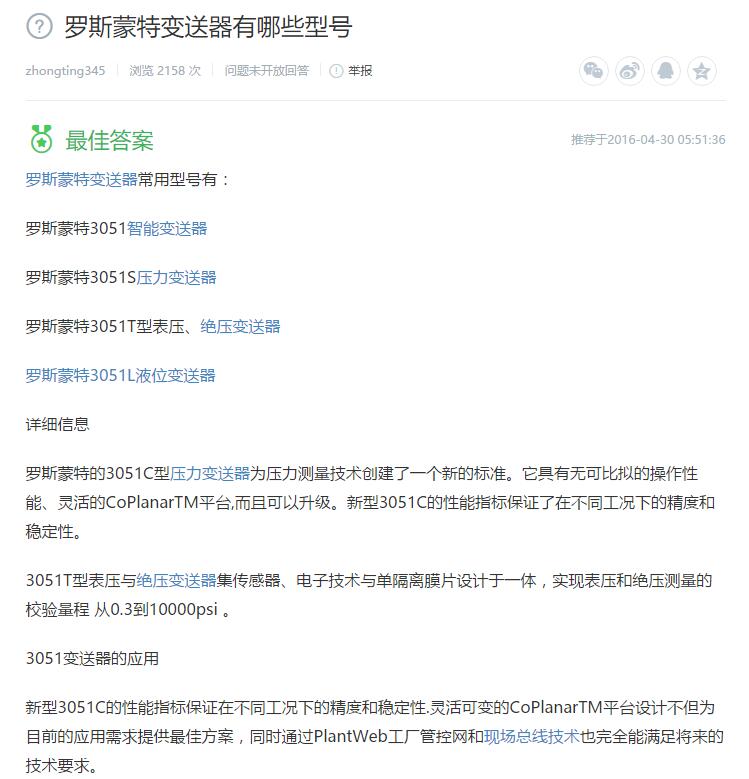 在安裝調(diào)試投入使用的近兩年時間內(nèi),四百多臺羅斯蒙特3051變送器經(jīng)受了考驗(yàn),在各種各樣的應(yīng)用中,沒有一臺出現(xiàn)過問題,保證了我們試車、生產(chǎn)的順利進(jìn)行。所以我們對3051變送器的質(zhì)量感到滿意和放心。