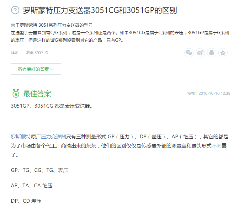 3051GP、3051CG 都是表壓變送器。 羅斯蒙特原廠壓力變送器只有三種測(cè)量形式 GP(壓力)、DP(差壓)、AP(絕壓),其它的都是為了市場(chǎng)由各個(gè)代工廠商搞出來的東東,他們的區(qū)別僅僅是傳感器外部的測(cè)量室和接頭形式不同罷了。GP、TG、CG、TG、表壓AP、TA、CA 絕壓DP、CD 差壓