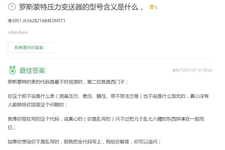 的表的代碼是最不好觀測(cè)的,第二位就是西門子;你這個(gè)即不說是什么表(測(cè)量壓力、差壓、靜壓、帶不帶法蘭等)也不說是什么型式的,真心沒有人能夠給你回答這個(gè)問題的;就像你現(xiàn)在寫的這個(gè)代碼,說真心的(你是亂寫的)只不過把幾個(gè)亂七八糟的東西拼湊在一起而已;如果你想說你不是亂寫的,那就把全代碼寫上,我給你解答,你可以追問;