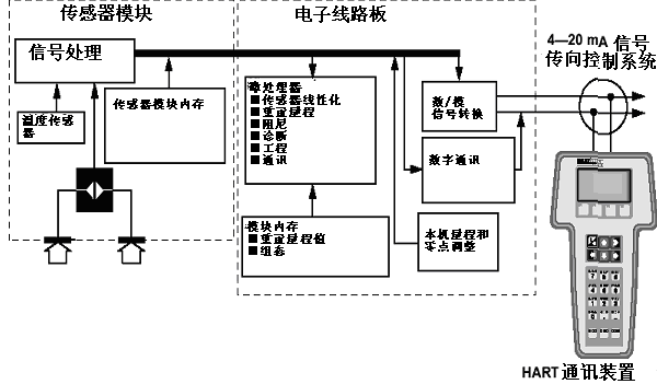 3051 型變送器主要部件為傳感器模塊和電子元件外殼。傳感器模塊包括充油傳感器系統(tǒng)(隔離膜、充油系統(tǒng)和傳感器)以及傳感器電子元件。傳感器電子元件安裝在傳感器模塊內(nèi)并包括一溫度傳感器電阻式測(cè)試檢測(cè)器)、儲(chǔ)存模塊和電容/數(shù)字信號(hào)轉(zhuǎn)換器(C/D 轉(zhuǎn)換器)。來(lái)自傳感器模塊的電子信號(hào)被傳輸?shù)诫娮釉鈿ぶ械妮敵鲭娮釉?。電子元件外殼包括輸出電子線路板(微處理器、儲(chǔ)存模塊、數(shù)字/模擬信號(hào)轉(zhuǎn)換器或 D/A 轉(zhuǎn)換器)、本機(jī)零點(diǎn)及量程按鈕和端子塊。