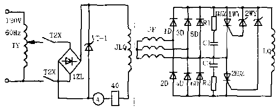 1 、工作原理如下:圖中虛線框內(nèi)為旋轉(zhuǎn)部分。在同步電動(dòng)機(jī)主軸上安裝一臺三相交流勵(lì)磁發(fā)電機(jī),該勵(lì)磁發(fā)電機(jī)的定子繞組和轉(zhuǎn)子繞組與一般交流發(fā)電機(jī)相比是反裝的,即定子勵(lì)磁,轉(zhuǎn)子發(fā)電。定子勵(lì)磁繞組JLQ ,由 120V , 60Hz 電源經(jīng)調(diào)壓器 TY 調(diào)壓,再由硅整流器 1ZL 整流后供給直流勵(lì)磁電源,與主軸一起旋轉(zhuǎn)的轉(zhuǎn)子繞組 JF 發(fā)出三相交流電,該三相交流電經(jīng)硅整流管 1D ~ 6D 整流后供給同步電動(dòng)機(jī)轉(zhuǎn)子繞組 LQ 勵(lì)磁電流。調(diào)節(jié)交流發(fā)電機(jī)定子勵(lì)磁繞組 JLQ 的勵(lì)磁電流,就可使勵(lì)磁發(fā)電機(jī)的轉(zhuǎn)子所發(fā)出的三相交流電壓得到調(diào)整,從而改變同步電動(dòng)機(jī)轉(zhuǎn)子勵(lì)磁繞組 LQ 的勵(lì)磁電流。同步電動(dòng)機(jī)起動(dòng)或停車時(shí)的滅磁環(huán)節(jié)和同步電動(dòng)機(jī) 的投勵(lì)環(huán)節(jié)都安裝在轉(zhuǎn)子上,均在旋轉(zhuǎn)狀態(tài)下工作。這種由勵(lì)磁發(fā)電機(jī)從轉(zhuǎn)子發(fā)電,整流器在旋轉(zhuǎn)狀態(tài)下進(jìn)行整流供給同步電動(dòng)機(jī) 轉(zhuǎn)子勵(lì)磁的方式,就不再需要有靜止部分和轉(zhuǎn)動(dòng)部分之間的相互接觸導(dǎo)電,完全省去了電刷和滑環(huán)的接觸。