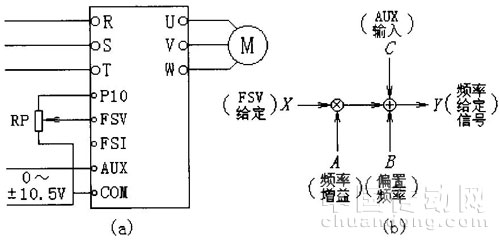 在實際生產(chǎn)中,變頻器的基本轉(zhuǎn)速由主給定信號給定。但在生產(chǎn)過程中,常常還需要根據(jù)其他信號對電動機的轉(zhuǎn)速進行修正(微調(diào))。例如,某機械的冷卻風機,其基本轉(zhuǎn)速由操作工根據(jù)具體情況進行調(diào)節(jié)。同時,當環(huán)境溫度發(fā)生變化時,要求轉(zhuǎn)速能自動地進行微調(diào)。一般的變頻器都能實現(xiàn)這種控制,而明電VT230S 系列變頻器(日本)則專門設(shè)置了一個輔助信號輸入端,并給出了十分明確的計算方法,如圖2所示。圖2(a)為外接給定端子的安排,F(xiàn)SV 是主信號給定端,AUX是輔助信號給定端。其邏輯關(guān)系如圖2(b)所示,圖中各量之間的關(guān)系是: