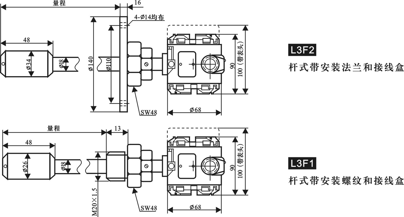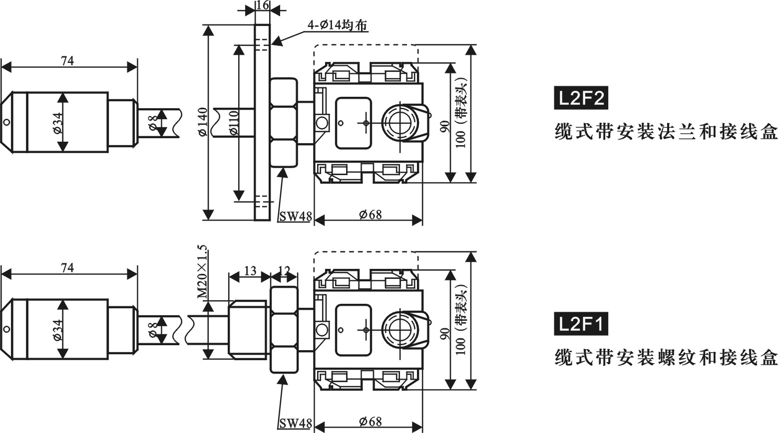 SLK-8010投入式液位變送器選用進(jìn)口帶防腐膜片敏感組件,將芯片不銹鋼(或四氟乙烯)殼體內(nèi)。頂部的鋼帽起保護(hù)傳感器膜片作用,也能使被測(cè)介質(zhì)流暢地接觸到膜片。該產(chǎn)品采用特制的防水通氣電纜,使感壓膜片的背壓腔與大氣良好相通,測(cè)量液位不受外界大氣壓變化的影響,測(cè)量準(zhǔn)確,長(zhǎng)期穩(wěn)定性好,并具有優(yōu)良的密封及防腐性能,可直接投入水、油等液體(包括腐蝕性液體)中長(zhǎng)期使用。聚四氟乙烯材料的外殼及電纜可測(cè)量多種強(qiáng)腐蝕性液體。 技術(shù)指標(biāo):量程:0-0.5~200mH2O 結(jié)構(gòu)尺寸:SLK8010/L2/L3型液位變送器SLK8010/L2型纜式分體液位變送器的壓力探頭為不銹鋼材料,電纜護(hù)套為橡塑,特殊要求可選擇聚四氟乙烯材料。