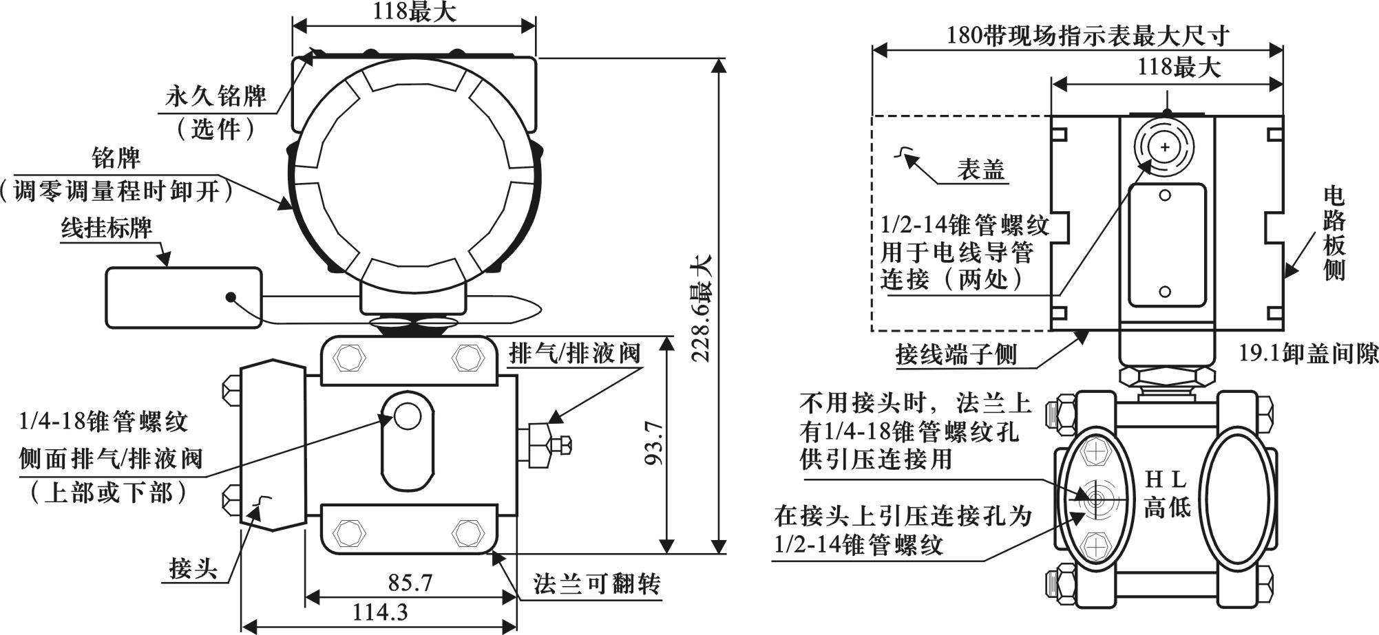 SLK1151AP型電容式絕壓變送器技術(shù)指標(biāo):遷移量:正、負(fù)遷移為最小調(diào)校量程的500% 超壓極限:施加壓力0(絕對壓力)-8MPa壓力,變送器不損壞;法蘭可承受68.9MPa的壓力。溫度影響:最大量程 零點誤差:為量程的0.5%/55℃;最小量程零點誤差:為量程的3.0%/55℃ 安裝位置影響:最大可產(chǎn)生±0.25kPa的零點誤差,但可校正,對量程無影響。 結(jié)構(gòu)尺寸: